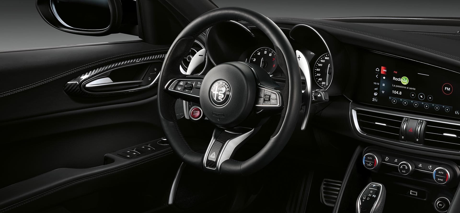 Sacīkšu automašīnu iedvesmota stūre, kas aprīkota ar vadības pogām un alumīnija pārnesumu pārslēgšanas slēdžiem, izceļ Quadrifoglio sportisko garu.